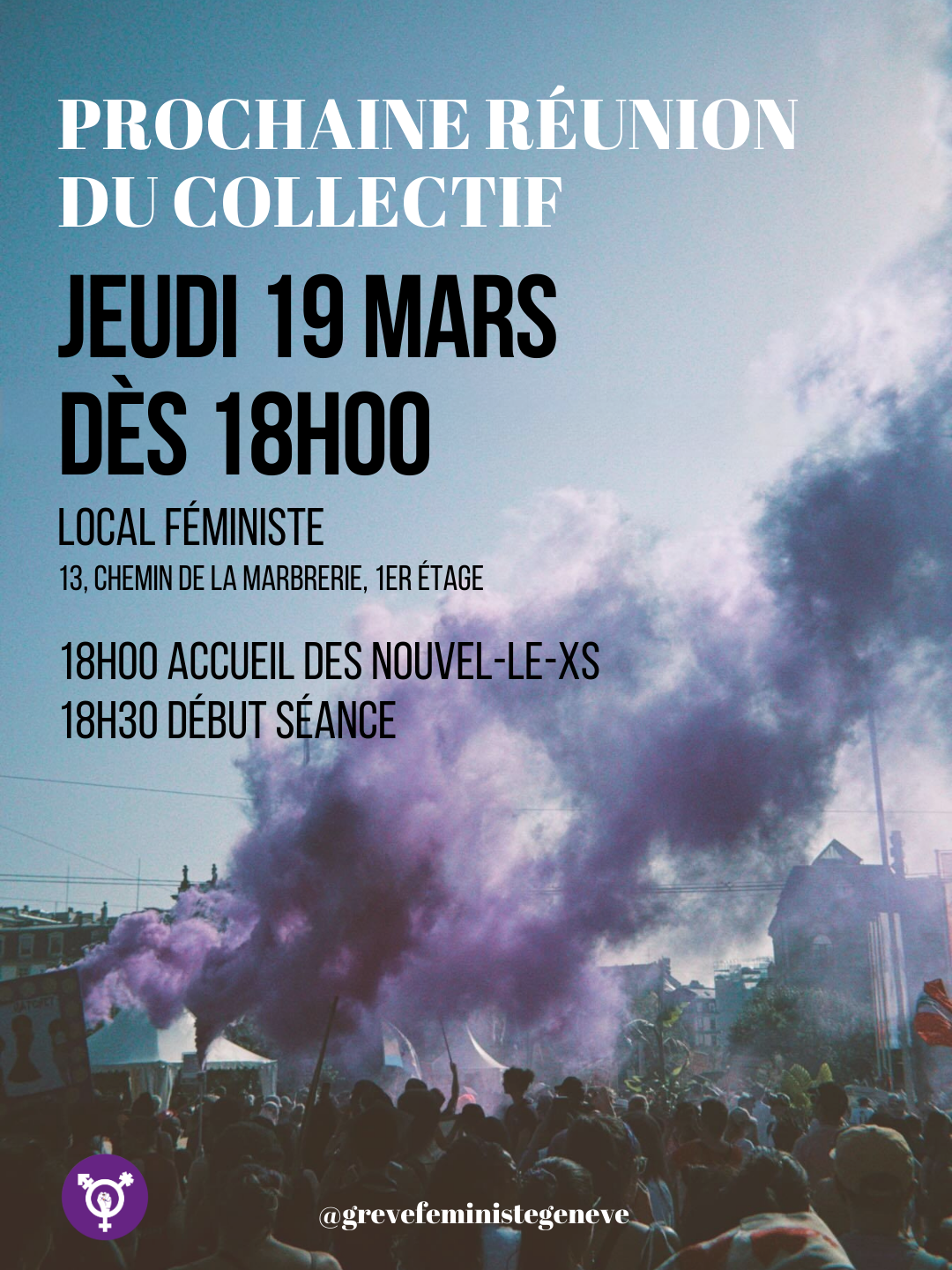 Pour le lien zoom, si tu reçois déjà nos mails tu recevras le lien pour la séance avec le mail de convocation. Si tu ne reçois pas encore nos mails, écris nous à info@grevefemniste-ge.ch